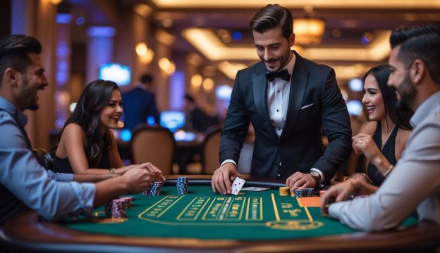 Seorang dealer blackjack profesional sedang membagikan kartu kepada pemain yang antusias di meja hijau dalam suasana kasino mewah.