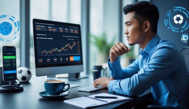 Seorang pria muda Indonesia sedang duduk di meja dengan laptop dan ponsel, fokus melihat data taruhan olahraga online.
