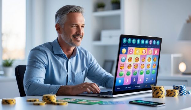 Seorang pria dewasa duduk di meja dengan laptop, fokus pada layar yang menampilkan antarmuka lotere digital, di ruangan kantor rumah yang terang dan rapi.